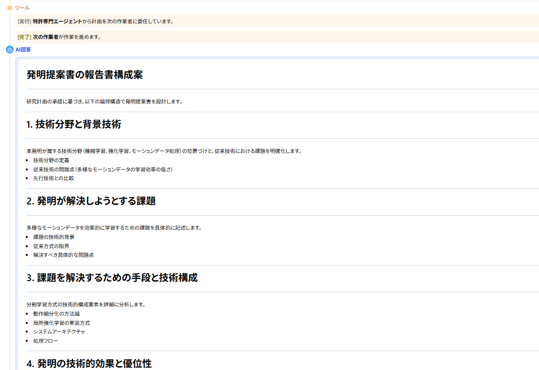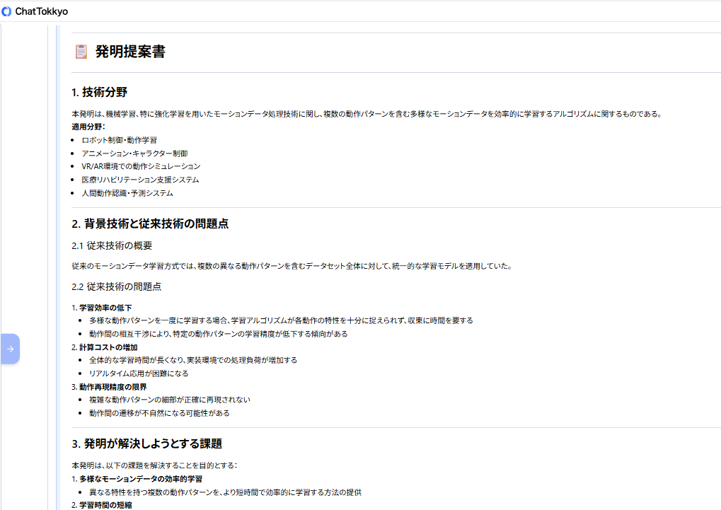 MyTokkyo.Aiは、アルゴリズム構想や学習フローをまとめた技術資料を入力することで、AIが内容を解析し、「課題」「解決手段」「技術的効果」という特許出願に必要な要素へ自動的に整理できる。また、ロボット制御や機械学習分野の先行技術を参照しながら検討を進められるため、発明の着眼点や新規性を短時間で整理できる点が評価された。