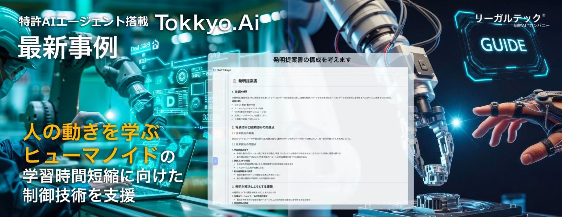 リーガルテック株式会社(本社:東京都港区、代表取締役社長:平井智之)は、人間と同様の身体構造を持ち、人の動作を再現するロボットであるヒューマノイドの模倣学習効率化技術に関する特許検討において、同社が提供する特許支援AIプラットフォーム「MyTokkyo.Ai」が活用されたことを発表する。本事例では、人間の動作を学習させる過程において、膨大なモーションデータ処理の非効率により訓練期間が長期化していた課題に対し、学習時間短縮を目的とした制御・学習方式について、特許化可能な発明要素の抽出および発明提案書の整理を行った。