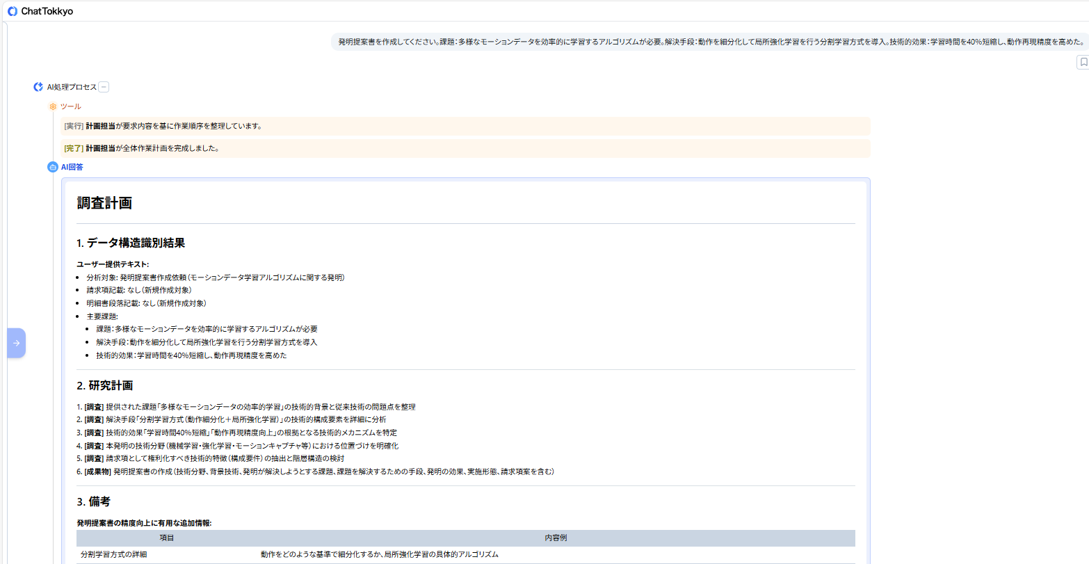 こうした状況を受け、研究開発段階の構想を効率的に特許検討へ落とし込む手段として、特許実務に特化したAIエージェントを備えるMyTokkyo.Aiが採用された。