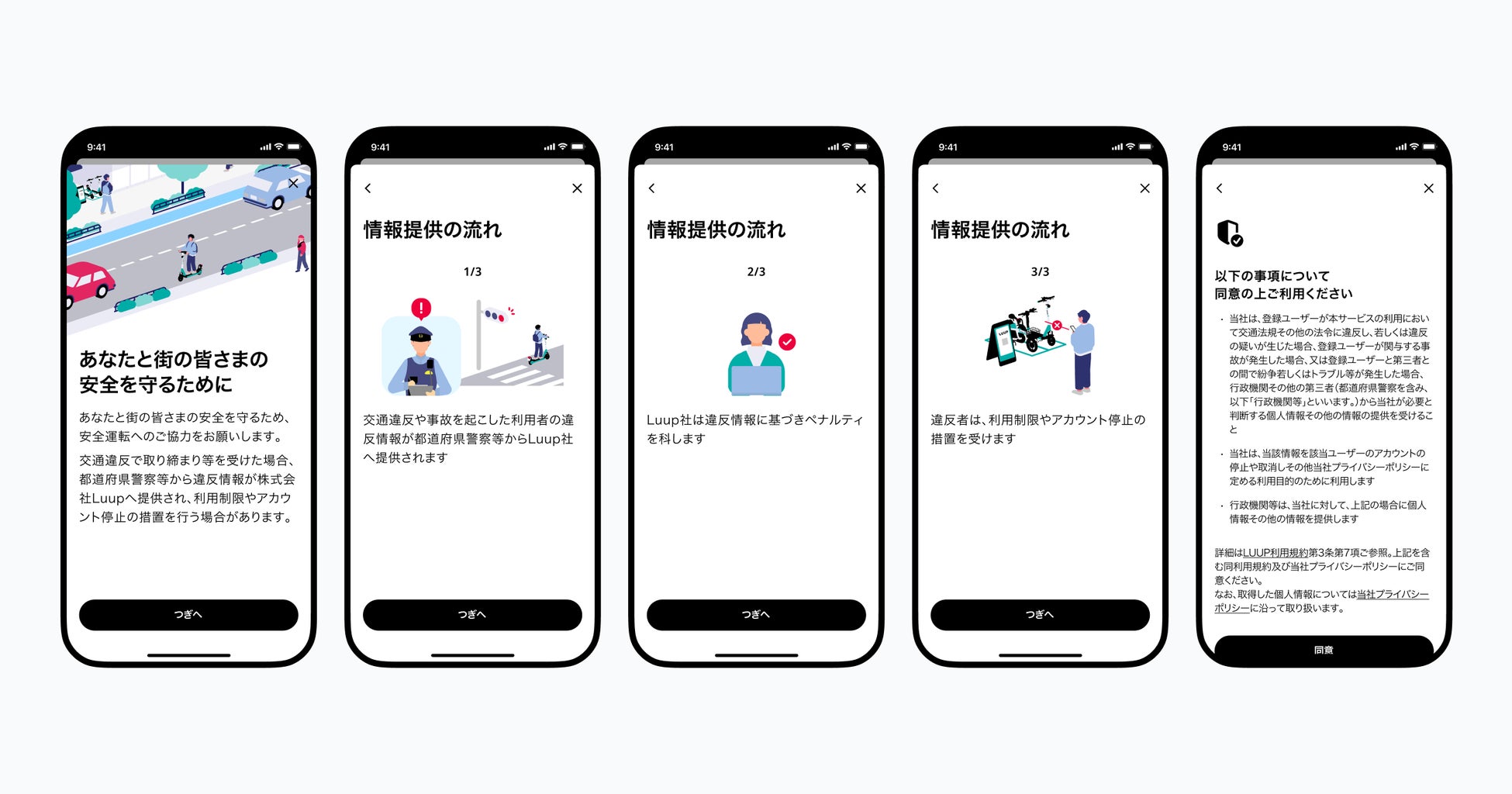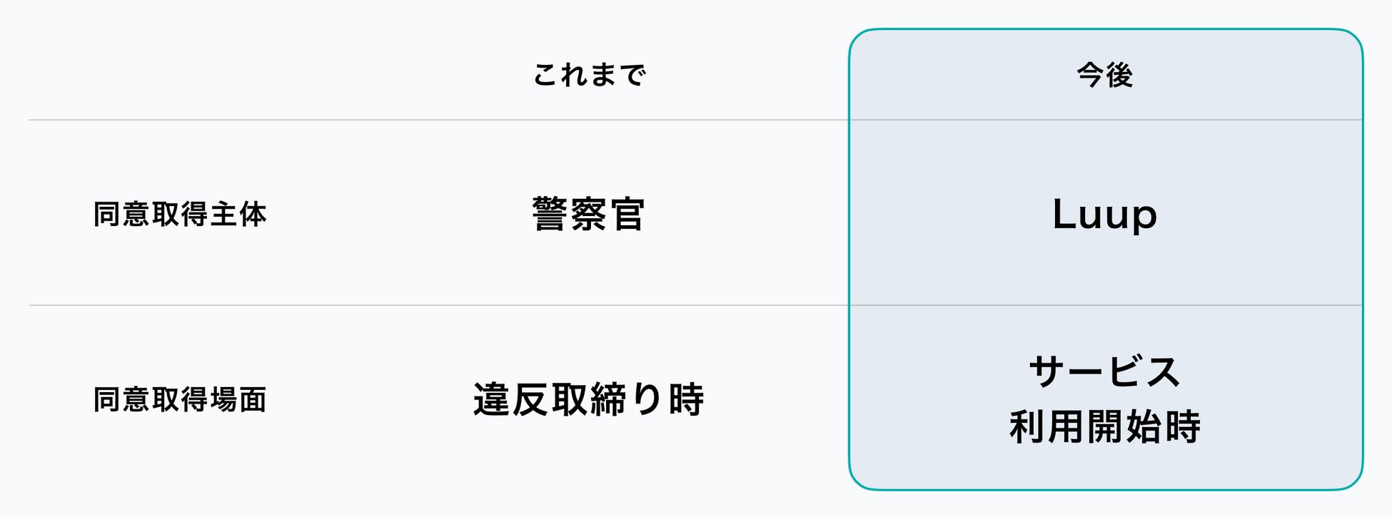 この変更により、Luupは利用者の皆様からの事前の明示的な同意に基づき、警察から受領した違反情報を用いて、違反した利用者のアカウント停止等を効果的に講ずることができるようになります。