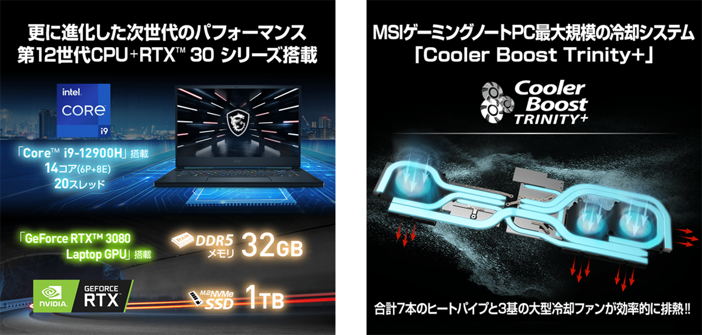 『Stealth GS66 12U』シリーズは、薄型ゲーミングノートPCの金字塔で日本国内でも大人気となっている「GS」シリーズの最新モデルです。ハイブリッドコアアーキテクチャを採用し、マルチタスク・ゲーミング・クリエイティブなどあらゆる用途において処理性能が大幅に向上した「第12世代インテル® Core™ i9 プロセッサー」を搭載。加えて、グラフィックス機能にはハイエンドゲーミングノートPC向けの超高性能GPU「GeForce RTX™ 3080 Laptop GPU」を搭載。4K解像度でPCゲームを快適に楽しめるパフォーマンスを発揮するだけでなく、高画質の4K動画編集や画像編集作業でも高いグラフィックス処理による高速処理を実現します。また、内部スペースの限られた薄型ゲーミングノートPCにおいて、高性能CPU&GPUの性能を安定的に発揮させるためには強力な冷却システムが欠かせません。合計7本のヒートパイプと3基の大型ファンを組み合わせた冷却システム「Cooler Boost Trinity+」を搭載し、薄型ゲーミングノートPCでも発熱を気にせずゲームやクリエイティブ作業に集中できるサーマルソリューションを提供します。