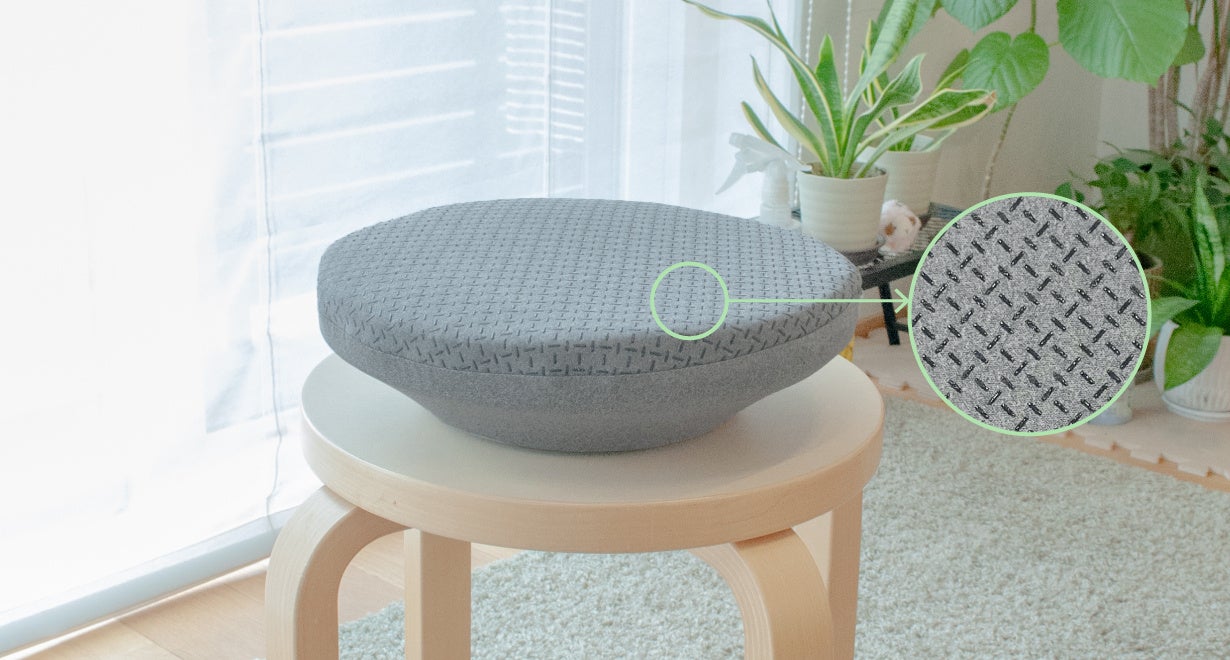 20度の絶妙な傾きが骨盤を前傾させるため、上に座ることで自然と良い姿勢が作られます。座面には、ペットや赤ちゃんにも配慮したシリコン素材の滑り止めをプリント。傾いてもお尻がズレにくく安定感があります。