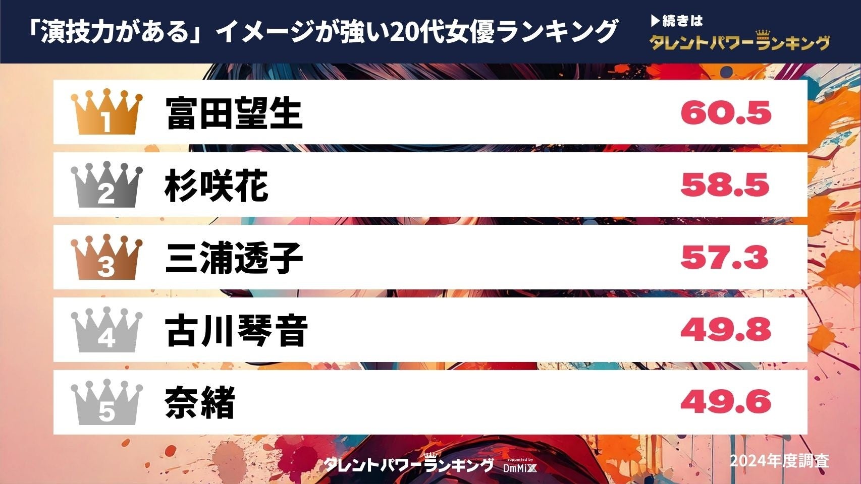 『タレントパワーランキング』では、タレントパワーランキングに登録されている、「演技力がある」イメージを持たれているなかでも、20代女優のスコアを調査。