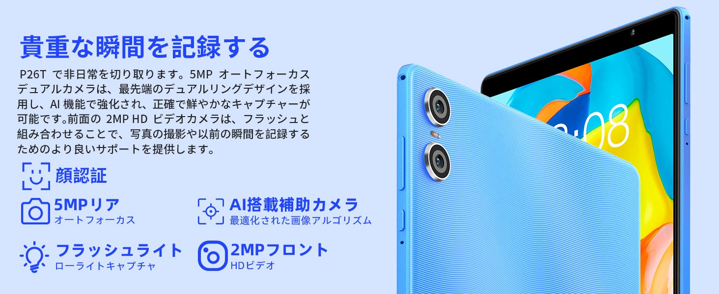 5MPオートフォーカスデュアルカメラは、最先端のデュアルリングデザインを採用し、AI機能で強化され、正確で鮮やかなキャプチャーが可能です。前面の2MP HDビデオカメラは、フラッシュと組み合わせることで、写真の撮影や以前の瞬間を記録するためのより良いサポートを提供します。フロントカメラは顔認証によるロック解除に対応しています。設定で顔情報を安全に登録し、簡単にタブレットシステムにアクセスできます。