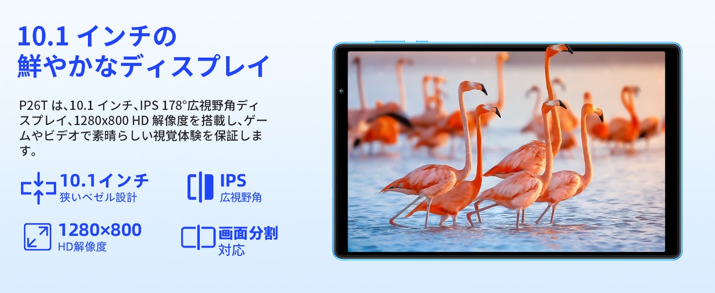 Teclast「P26T」は、10.1インチ、IPS 178°広視野角ディスプレイ、1280x800 HD解像度を搭載し、ゲームやビデオで素晴らしい視覚体験を保証します。6mm幅の超薄型ロングエッジベゼルを採用し、従来の10インチタブレットよりもスリムになっています。背面には、特殊なウェーブパターンのテクスチャーデザインで、手になじみ、滑りにくく、さまざまな光の条件下で光を反射させることができます。