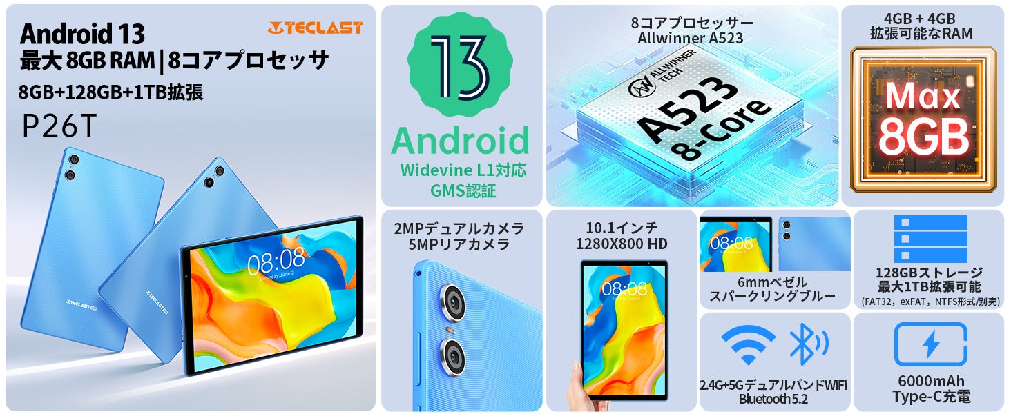 10インチ / Android 13 / 8GB(4+4GB拡張)RAM+128GB ROM+1TB拡張 / WideVine L1対応 / WiFiモデル / デュアルカメラ / 画面分割 / 3.5mmヘッドフォンジャック / 児童守護