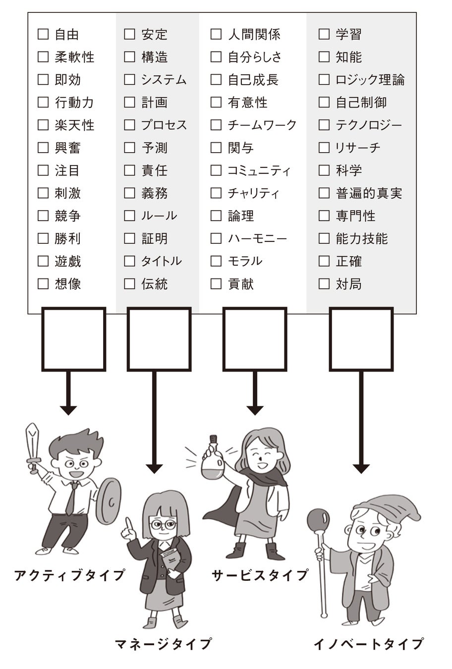 ービス』『イノベート』という4タイプに分類する性格診断チェック表を掲載しています。