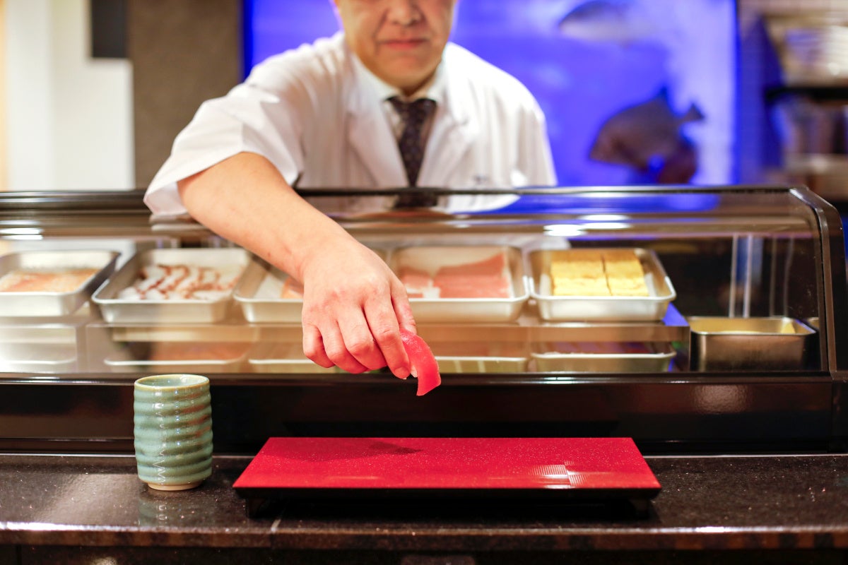 チェーン店でありながら板前のいる「活魚寿司にぎり長次郎」。魚を〆て、さばいて、にぎる。板前の仕事ぶりを、ぜひその目でお確かめください。