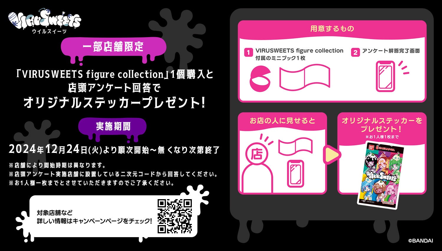 「VIRUSWEETS figure collection」を1個購入し、店頭アンケートに回答すると、オリジナルステッカー(全1種)がもらえるキャンペーンを実施中。