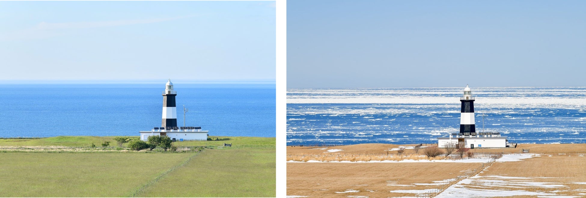 オホーツク海に面した能取岬からは知床連山を見渡すことができ、夏季の沖合にはクジラやイルカが回遊し、冬季には流氷が訪れます。このような素敵な岬の先端に能取岬灯台があり、映画やCMのロケ地としても数多く利用されている魅力的な観光地となっています。