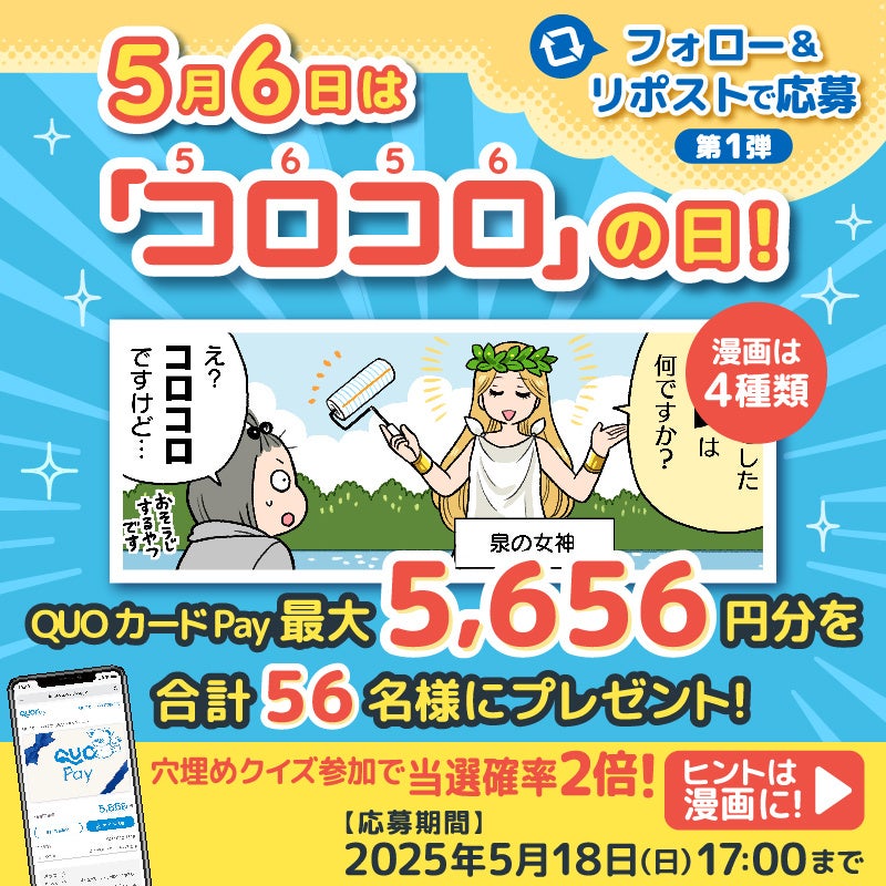 当社の公式Xアカウント「@nitomsjapan」をフォローし、『コロコロ』をテーマとした漫画を掲載したキャンペーン投稿をリポストした方の中から、抽選で計56名に、QUOカードPay(コードタイプ)をプレゼントします(5,656円分×3名、560円×53名)。さらに、漫画の内容をヒントにしたクイズの回答を、指定のハッシュタグをつけて投稿した方は、当選確率が2倍になります。