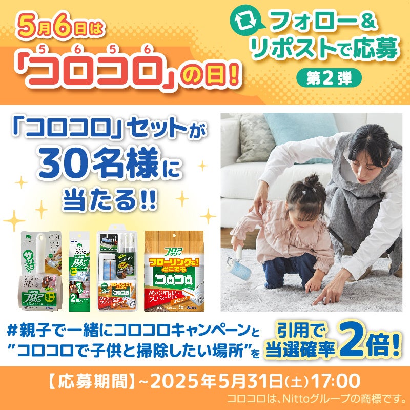 当社の公式Xアカウント「@nitomsjapan」をフォローし、該当のキャンペーン投稿をリポストした方の中から、抽選で30名に、「親子で一緒にお掃除セット」(『コロコロミニ フロアクリン』の本体とスペアテープ、『コロコロ フロアクリン SC ジョイントトレイ』の本体とスペアテープ)をプレゼントします。さらに、キャンペーン投稿に指定のハッシュタグをつけた上で、コロコロでこどもと掃除したい場所を記載して引用した方は、当選確率が2倍になります。