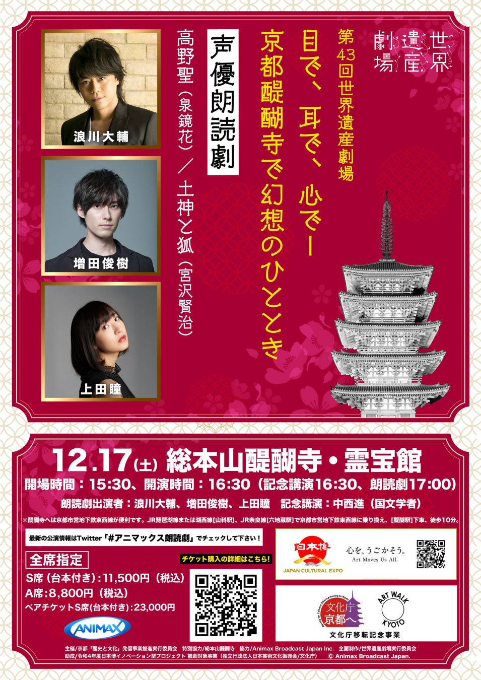 声優 浪川大輔、増田俊樹、上田瞳が出演!【人気声優】×【世界遺産】が紡ぎだす大人のための朗読劇「第43回世界遺産劇場 目で、耳で、心でー 京都醍醐寺で幻想のひととき 声優朗読劇 高野聖/土神と狐」
