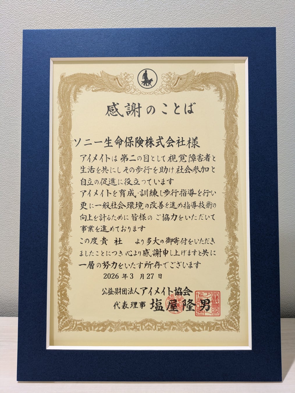 ソニー生命保険株式会社(代表取締役社長:坪田 博行、以下「当社」)は「アイメイト(盲導犬)育成による視覚障がい者の社会参加の支援」を目的として、2026年3月27日に公益財団法人アイメイト協会(代表理事:塩屋 隆男、以下「アイメイト協会」)へ寄付金の贈呈を行いました。また、四半世紀以上にわたる継続的な支援に対し、アイメイト協会 塩屋 隆男代表理事より感謝状が授与されました。