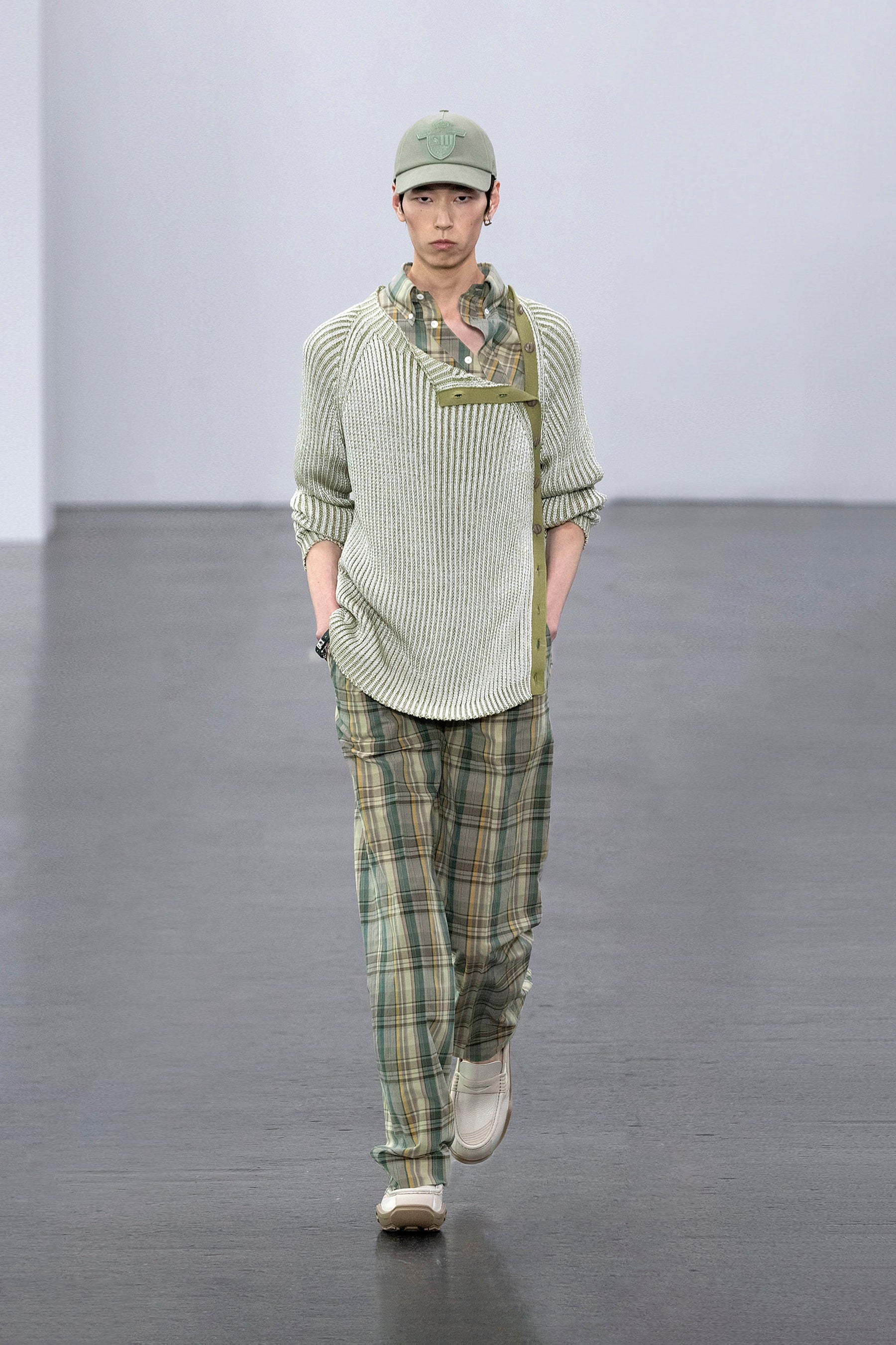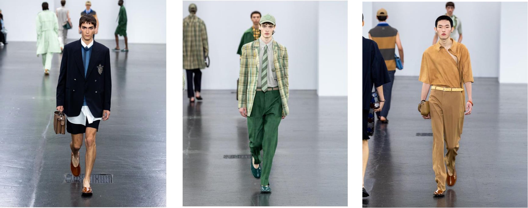 本コレクションは、頭からつま先まで、1925年にローマの馬具職人からフェンディ家に伝授された「セレリア(Selleria)」の技巧を堪能させてくれます。「セレリア」が変則的なピンストライプのスーツ地ジャカードとして再解釈されると同時にストライプや同系色の「FF」ロゴとしてリネンや豪華なテクスチャーにあしられます。また、日本のボロデニムに表面加工として施される他、張りのあるウールのアウターウェアやレザーグッズには極限までミニマルなフレームとして表現されます。ボリューム感のある布地のボンバージャケット、流れるようなトレンチコート、3つボタンのブレザーと、脚をゆったりとカットしたスラッシュトラウザーズの組み合わせのように、微妙なボリューム感がそっと過ぎ去さった時代をささやいています。服装の正確性を捻じ曲げるようなディテールも登場します。ポプリンシャツの袖は肘で切り込まれて長くも短くも着用することが可能となり、ポロシャツの前立ては首から肋骨へと捻じれています。アシンメトリーなシルクニットは、肩のボタンを外すとエアリーなモジュール性を生み出します。プリーツョートパンツの上に、シルクタイが付いたパッチポケットのロングオーバーシャツがレイヤードされ、リネン、レザー、マドラスチェックのコットン、超軽量スエードのトーンを合わせた短いサマージャケットの下に重ねられています。