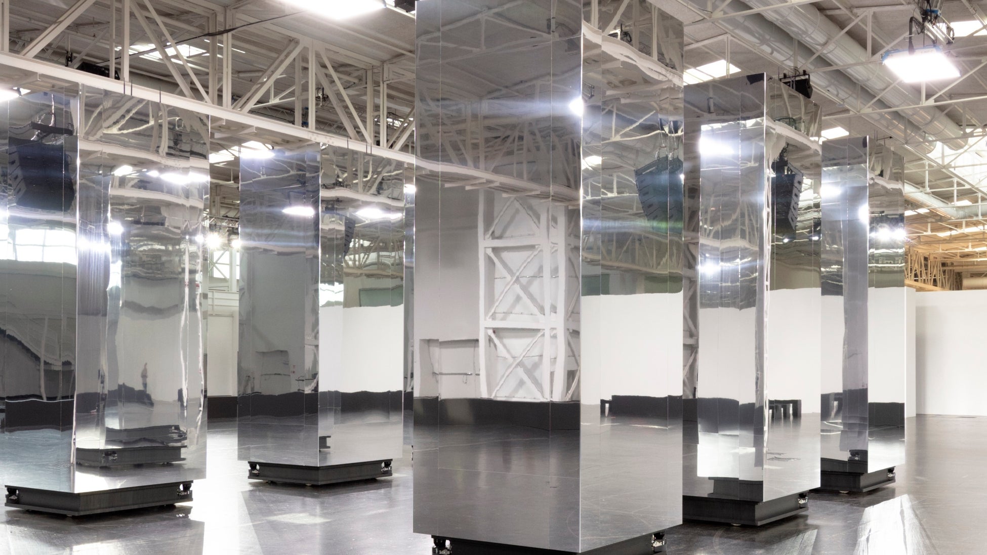 フェンディ 2025年春夏 メンズコレクションのショーは、ミラノにある「Superstudio Maxi」の7,000平方メートルに及ぶオープンスタジオで行われました。ここはヨーロッパで初めてLEEDゴールド認証を授与されたイベントスペースです。ニコ・ヴァセラーリ(Nico Vascellari)により設計されたミニマルなセットデザインは、ショー全体を通じてモデルの軌道を追跡する6本の可動式ミラーの柱が特徴で、無限の回廊と反射を創出します。ヴァシェラーリがロッコ・ランピーノ(Rocco Rampino)と共同制作したエレクトロニックサウンドトラックは、コレクションとその風通しの良い日光のセッティングに呼応してデザインされた、振動するロマンティックなビートを際立たせています。