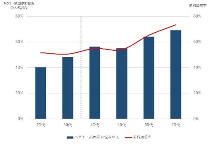 サンスターが実施した調査※3によると、年齢を重ねるとお口の悩みのある人が増え、50代以降は歯科医院への通院率が高まる傾向にあります。歯科医院では、歯周病対策のために歯間ブラシを推奨しており、歯科医院の通院をきっかけに使用する人も多いことが分かっています。今回、歯間ブラシを使用したことがない人でも、手に取っていただきやすいようにシリーズで最細となるサイズを開発しました。