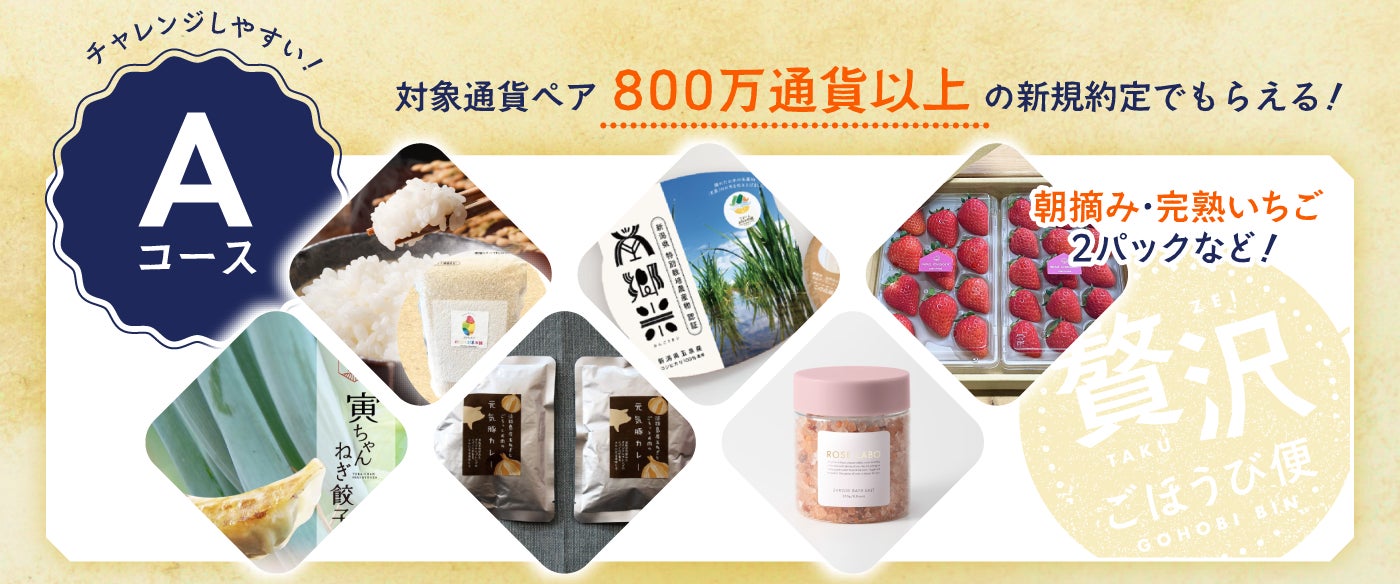キャンペーン期間中に、米ドル/円(USD/JPY)およびロシアルーブル/円(RUB/JPY)を除く、当社が取り扱う32通貨ペアにおいて、合計800万通貨以上の新規約定取引をされたお客さま全員に、日本各地の“こだわりの逸品”をプレゼントいたします。