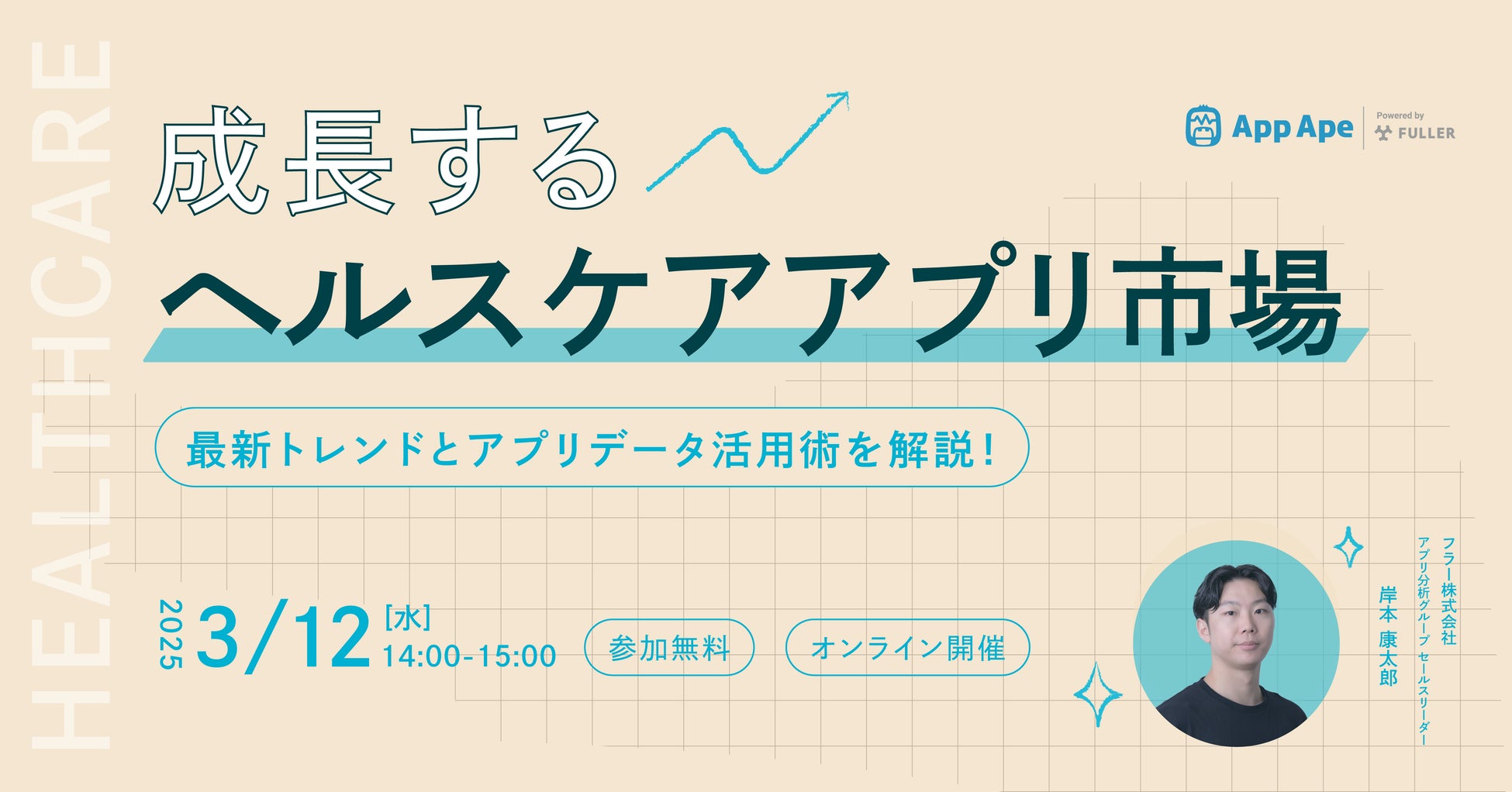 アプリ市場分析サービス「App Ape(アップ・エイプ)」を手がけるフラー株式会社(本社:新潟県新潟市、代表取締役社長:山﨑将司、以下「フラー」)は、成長するヘルスケアアプリ市場の最新トレンドとアプリデータ活用術を解説するセミナーを2025年3月12日(水)に開催します。