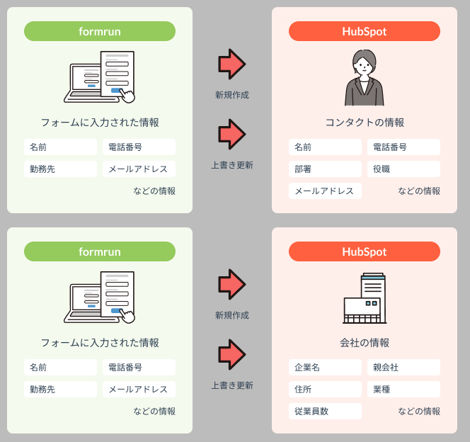 『formrun』と『HubSpot』との連携機能は、『formrun』に入力された情報を『HubSpot』のコンタクトや会社に自動送信することで、顧客情報の管理の手間やコストを大幅に削減できる機能です。