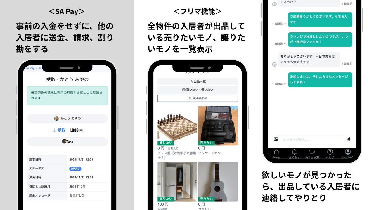 決済機能:入金不要で割り勘や送金が簡単にできる「SA PAY」や入居者間で物品のやり取りができる「フリマ」を搭載