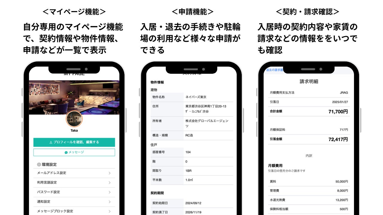 サポート機能:入退去の契約手続きや管理会社からのお知らせ、各種申請など入居中の手続きや申請ができる「My Page」を搭載