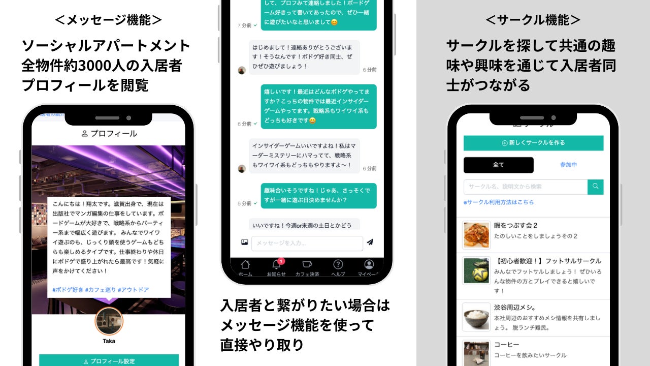 コミュニケーション機能:住人同士が気軽に交流できる「メッセージ」や、共通の趣味・関心を持つ仲間とつながれる「サークル」を搭載