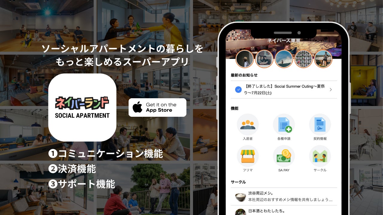 株式会社グローバルエージェンツ(本社:東京都渋谷区、代表取締役:山﨑剛)は、当社が運営する交流型賃貸マンション「ソーシャルアパートメント」の入居者向けに、一つのアプリで多様な機能を持つスーパーアプリ「ネイバーランド」を本日より提供開始します。「ネイバーランド」は、契約手続き、SNS、決済機能など多様な機能を備えており、入居者はソーシャルアパートメントでの生活が便利になる機能を、このアプリひとつで完結できるようになります。