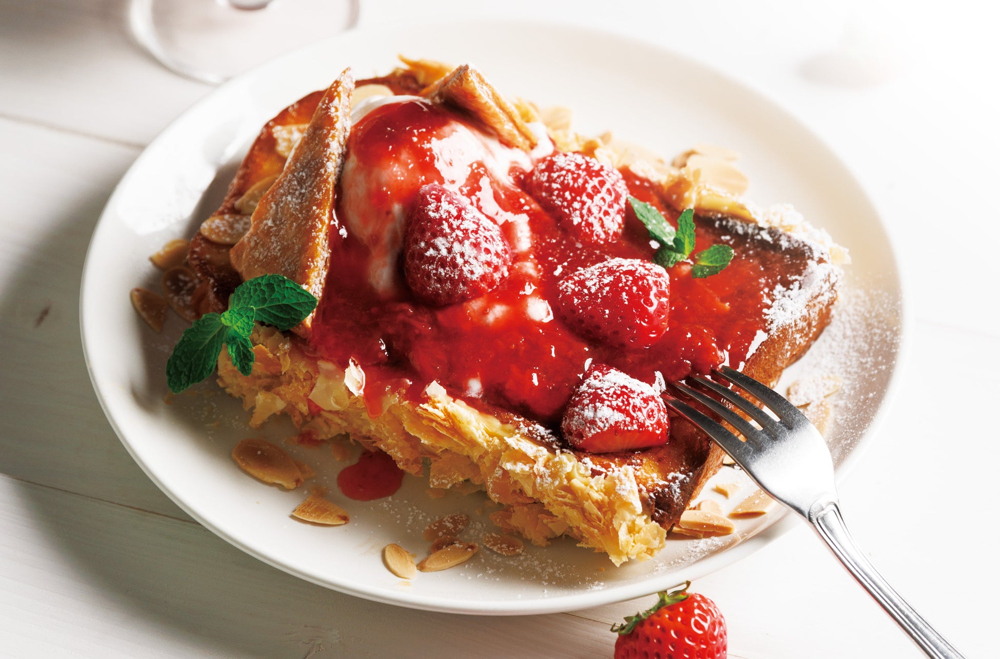 ブリオッシュパンにカスタードとクリームチーズをサンドし焼き上げたフレンチトーストに苺とラズベリーの甘酸っぱい自家製ベリーソースを合わせた”ナポレオンパイ”のようなフレンチトースト。サクサクパイと 苺のハーモニーをお楽しみください。