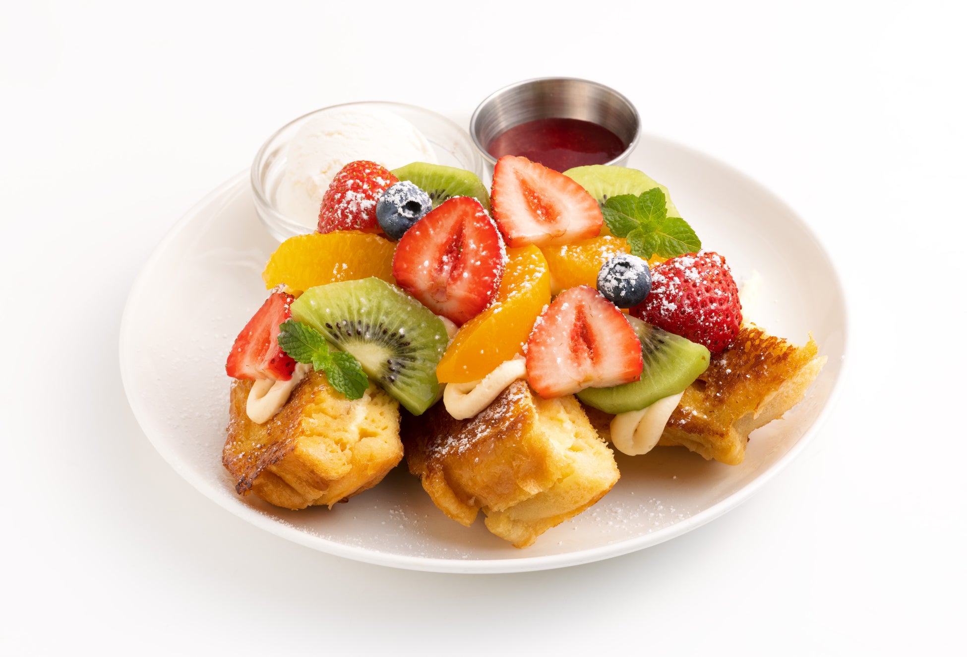 クリームチーズを挟んで焼き上げたフレンチトーストに、カスタードと生クリームを合わせた「ディプロマット」をたっぷりのせ、いちご、オレンジ、黄桃、キウイ、ブルーベリーの5種のフルーツをのせたフルーツタルトのようなフレンチトースト。別添えのラズベリーソースも味のアクセントに。