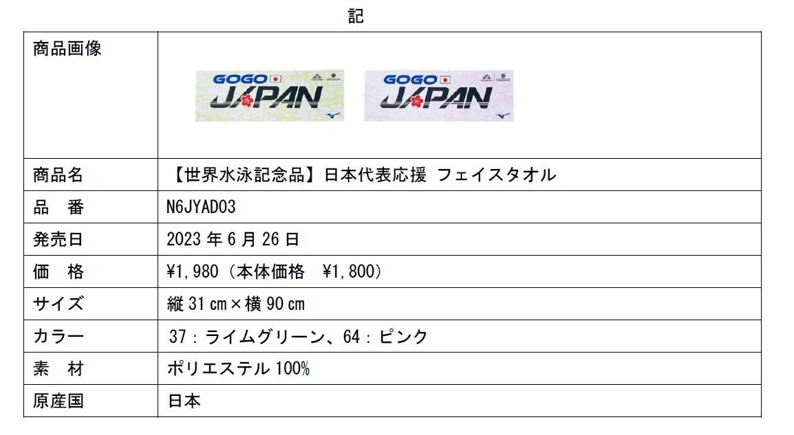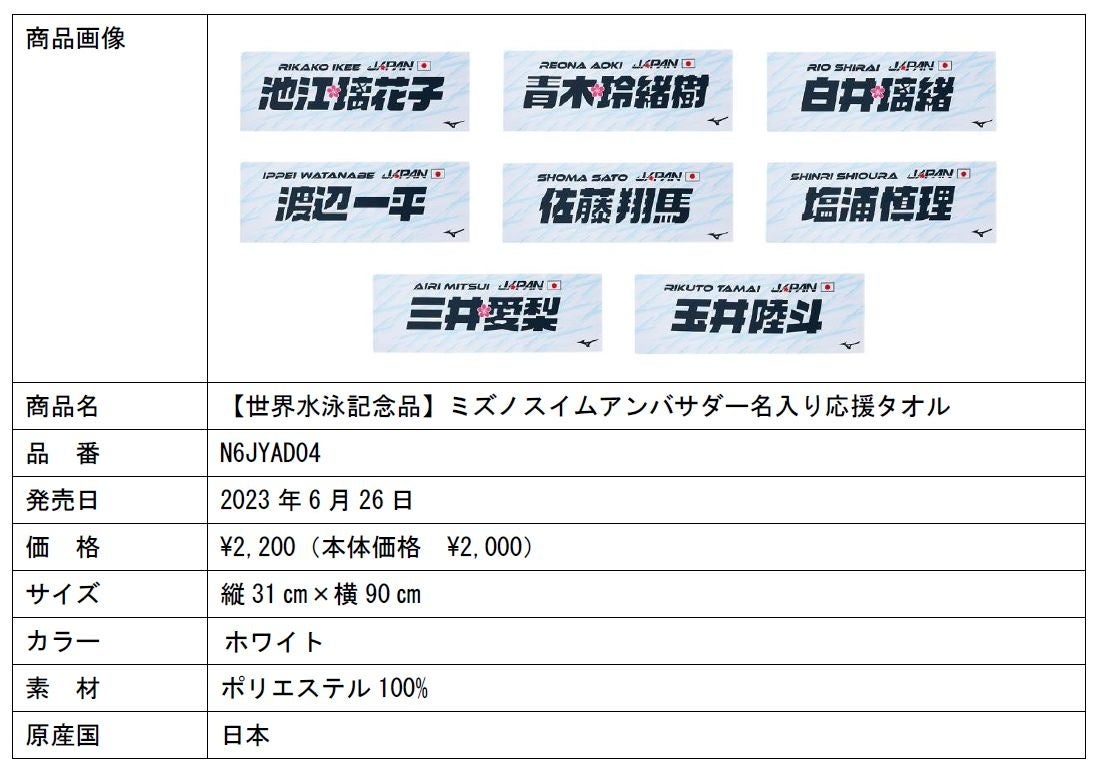 ミズノは、「世界水泳選手権2023福岡大会」(2023年7月14日~7月30日開催)に出場する日本代表選手応援グッズを6月26日からミズノ公式オンライン及び一部直営店(ミズノプラス福岡三越店など)で販売します。応援グッズはミズノブランドアンバサダーの池江璃花子選手など日本代表選手の名前やJAPANのロゴをデザインした、熱い応援にぴったりの冷感タオルとなります。