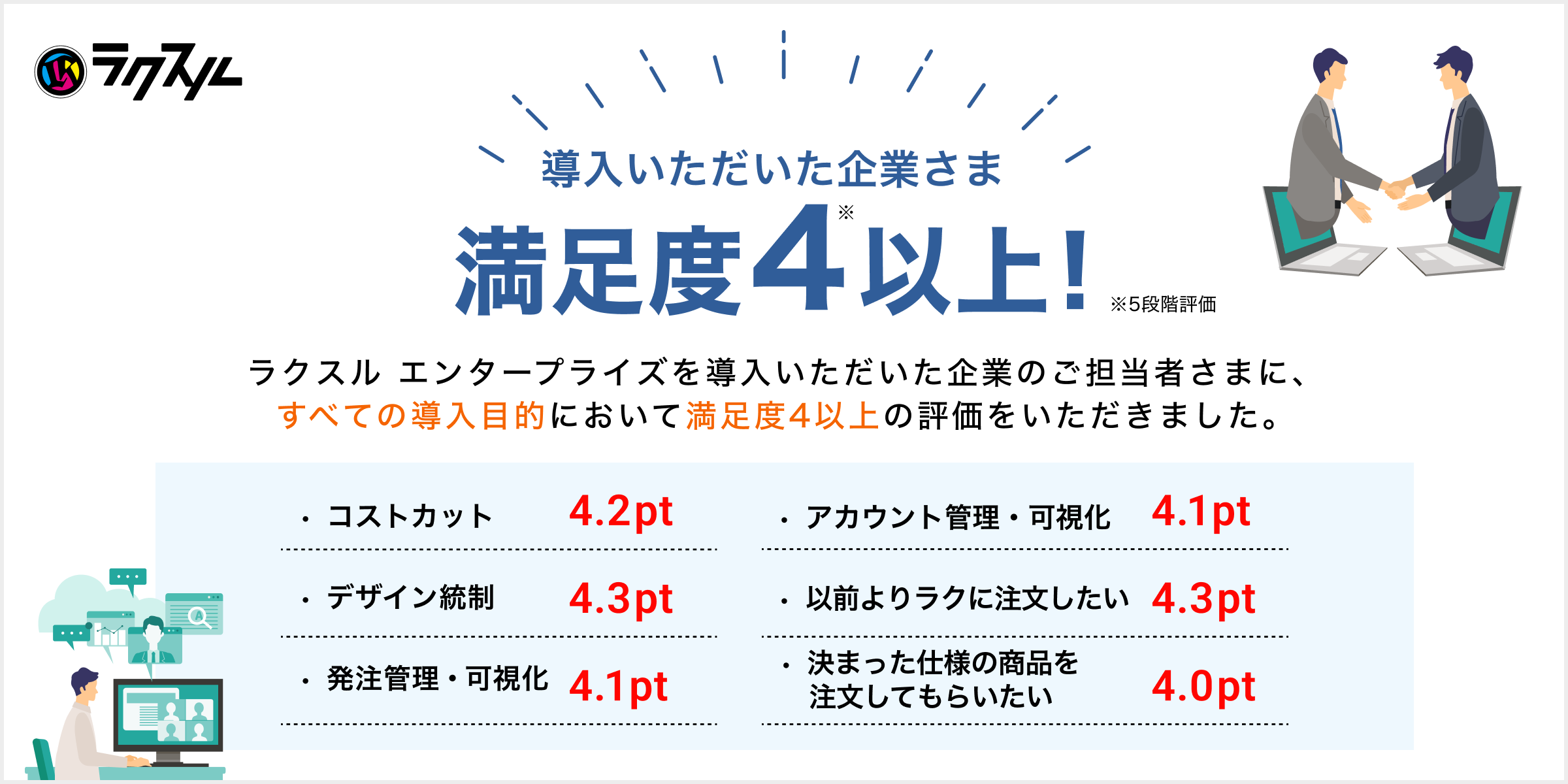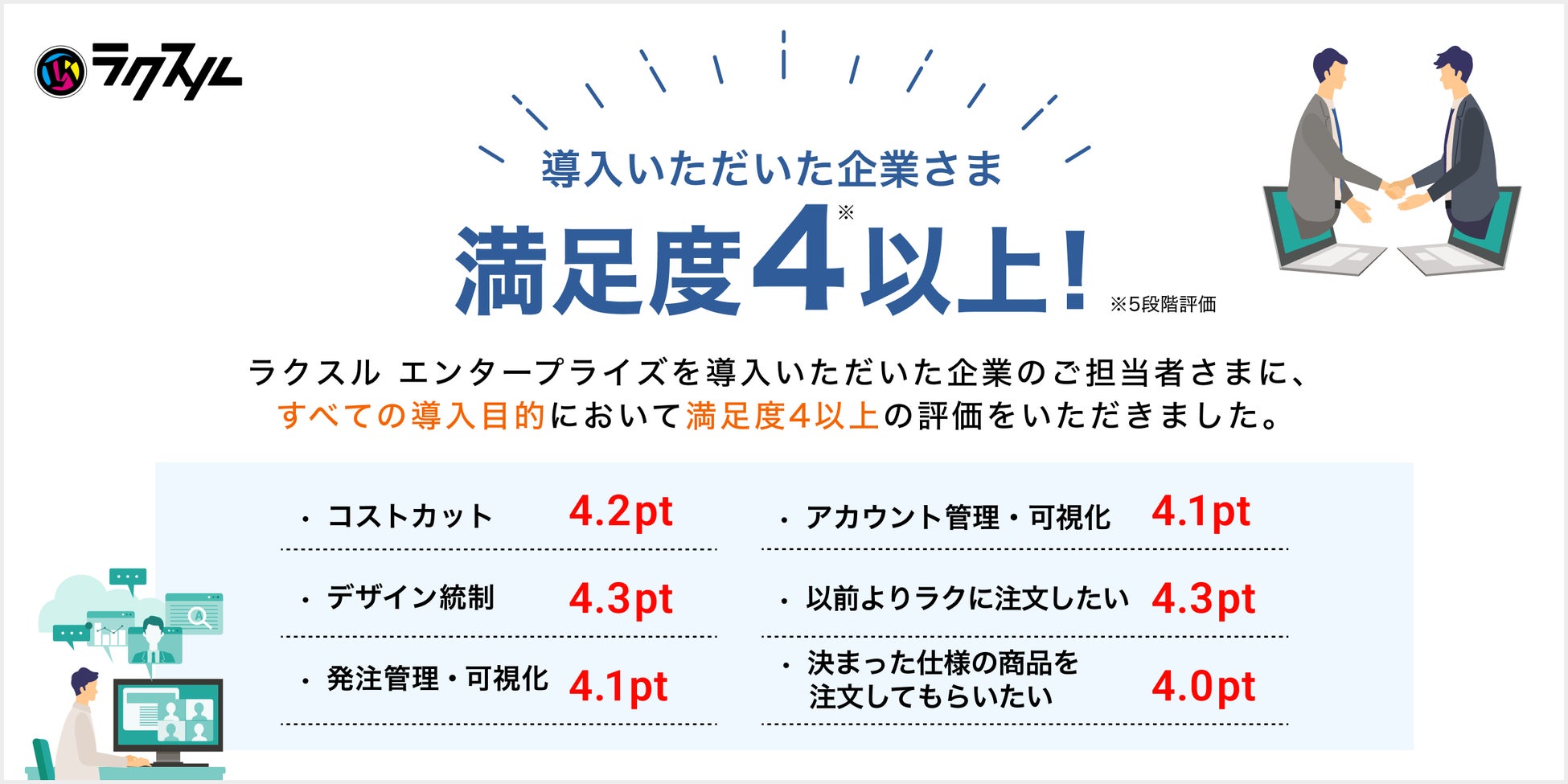 ラクスル エンタープライズを導入いただいた企業のご担当者さまに、導入目的がかなえられたかの満足度を5段階でお聞きしたところ、すべての導入目的において満足度4以上の評価をいただきました。