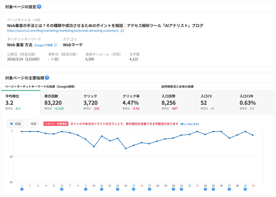 リライトが必要と判定されたページには、レポート画面上で「リライト・改善推奨」ラベルが表示され、優先的に改修すべきページを簡単に特定することが可能です。
