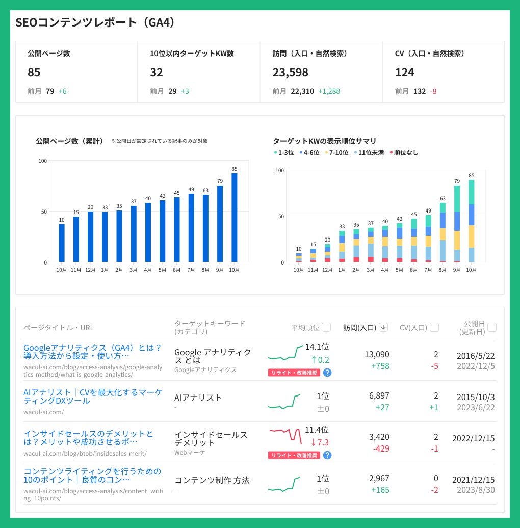改善が必要なページを効率的に特定でき、SEO施策の打ち手検討やリソース配分の最適化に役立てることができます。