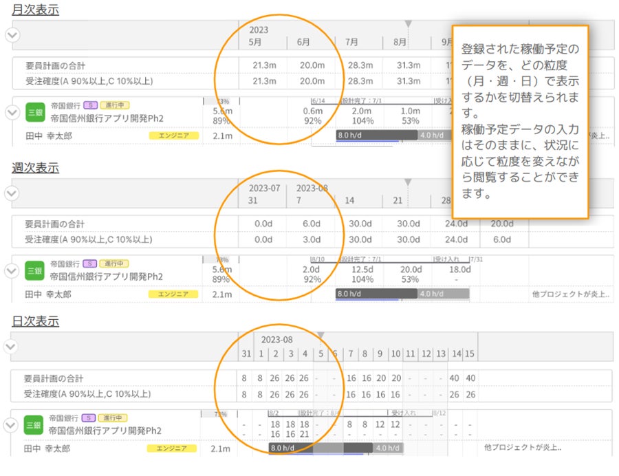 これまで月単位を基本としていた要員計画・稼働状況管理を、週単位や日単位でも管理できるようになりました。これにより、より細かい単位で管理を行う企業様の予実管理精度を上げていくとともに、デザイン会社や広告会社など、短い期間のプロジェクトの多い企業様でも使いやすくなりました。