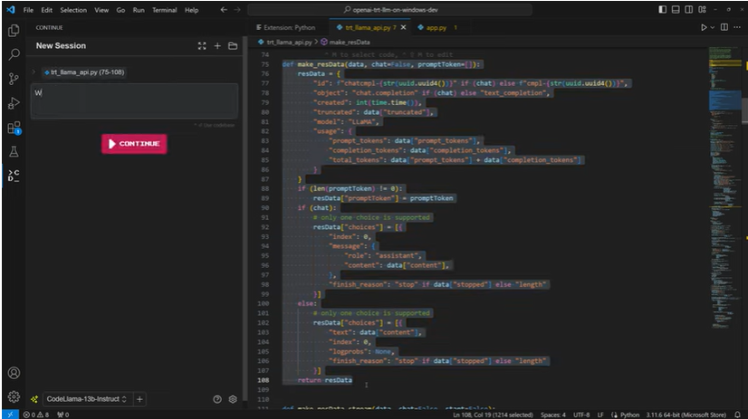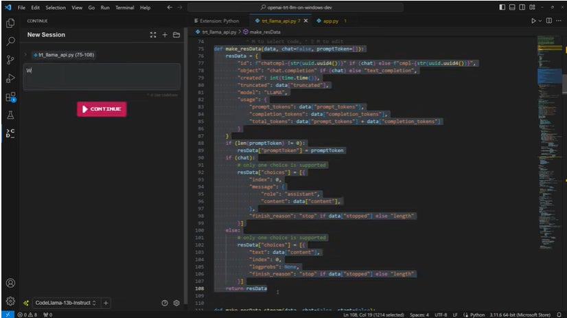 この課題に対処するために、NVIDIA は、TensorRT-LLM for Windows が、新しいラッパーを通じて OpenAI の広く普及している ChatAPI と同様の API インターフェースを提供できるようにし、RTX を搭載した PC 上でローカルに実行するモデルやアプリケーションを設計する場合でも、クラウド上で実行する場合でも、開発者に同様のワークフローを提供します。わずか 1、2 行のコードを変更するだけで、何百もの AI を搭載した開発者プロジェクトやアプリケーションが、高速なローカル AI の恩恵を受けられるようになります。ユーザーは自分のデータを PC に保持でき、データセットがクラウドにアップロードされる心配はありません。