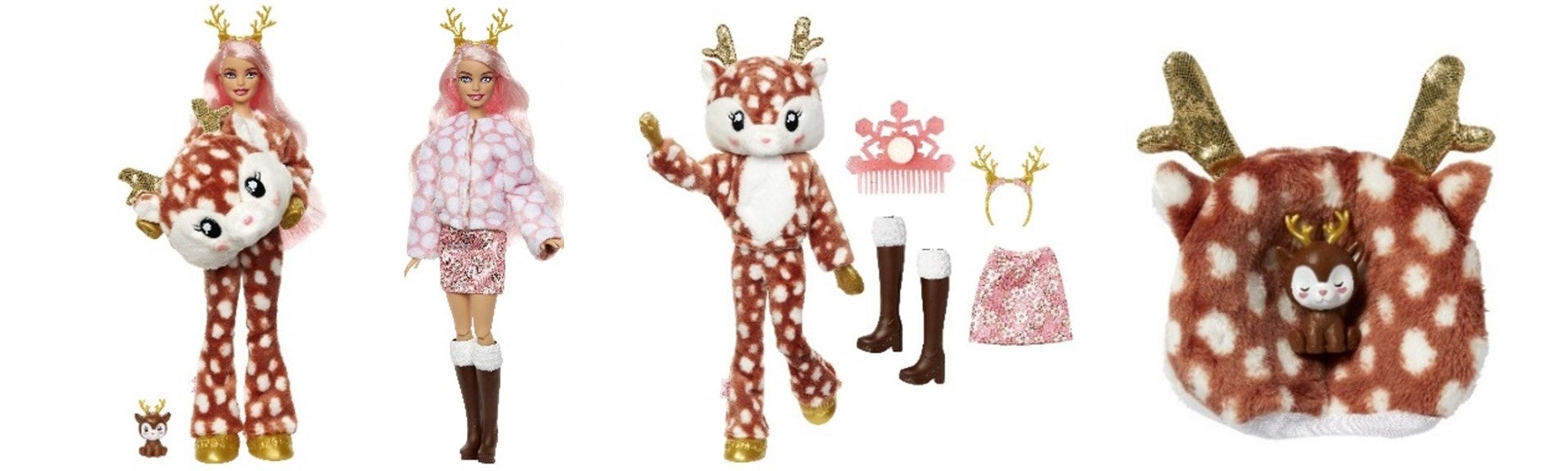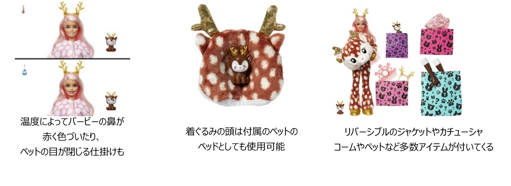 シカの着ぐるみに合わせて、サプライズパックにはミニペットのシカ、ピンクの花柄スカート、シカの角のカチューシャ、ブラウンのブーツ、雪結晶の形をしたコームが含まれています。シカ柄のジャケットはリバーシブルになっており、裏返すとベビーピンクカラーのキュートな水玉模様のジャケットが登場します。着ぐるみの中からはピンクのロングヘアーのバービーが登場し、ベビーピンクの水玉模様のジャケットとピンクのスカートとブーツを合わせて着せ替え遊びも楽しめます。