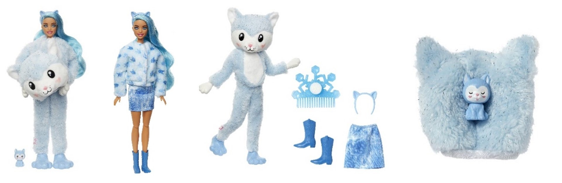 パステルブルーのハスキーの着ぐるみに合わせて、サプライズパックにはミニペットのハスキー、ブルーのスカート、耳のカチューシャ、ブルーのブーツ、雪結晶の形をしたコームが含まれています。キラキラとしたパステルブルーのジャケットはリバーシブルになっており、裏返すとブルーカラーのジャケットが登場します。着ぐるみの中からはブルーウェーブのロングヘアーのバービーが登場し、ブルーのジャケットとスカートとブーツを合わせて着せ替え遊びも楽しめます。