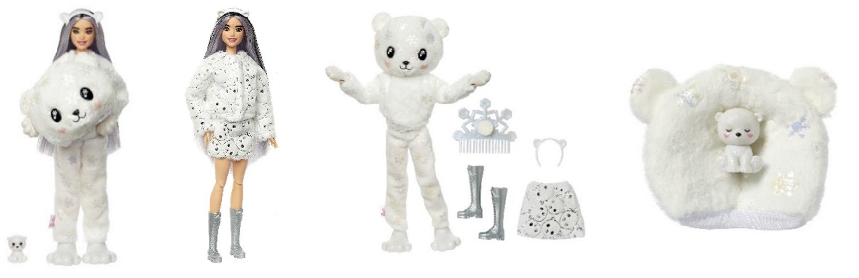 キラキラした雪結晶がデザインされた真っ白なしろくまの着ぐるみに合わせて、サプライズパックにはミニペットのしろくま、しろくま柄のスカート、耳のカチューシャ、シルバーのブーツ、雪結晶の形をしたコームが含まれています。雪結晶がデザインされた真っ白なジャケットはリバーシブルになっており、裏返すと真っ白なしろくま柄のジャケットが登場します。着ぐるみの中からはブラックとシルバーのロングヘアーのバービーが登場し、しろくま柄のジャケットとスカートとシルバーのブーツを合わせて着せ替え遊びも楽しめます。