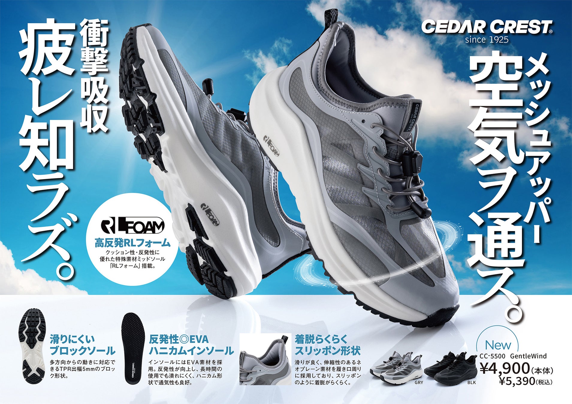 株式会社チヨダ(東京都杉並区 代表取締役社長 町野 雅俊)は、プライベートブランド「CEDAR CREST(セダークレスト)」から通気性と衝撃吸収に優れた高機能スニーカー「CC-5500 GentleWind」をシュープラザ、東京靴流通センター、公式オンラインショップ「kutsu.com」などで発売いたしました。