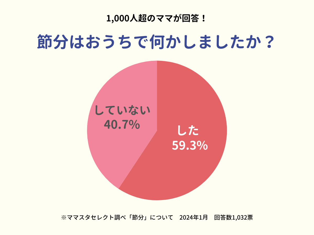 園や学校で節分行事がおこなわれることもあると思いますが、今回ママスタセレクトで実施したのは「家庭での節分の過ごし方」について。「節分はおうちで何かしましたか?」の設問に対し、「した」「していない」2つの解答を設定。1,000人を超える人たちから回答を得ることができました。