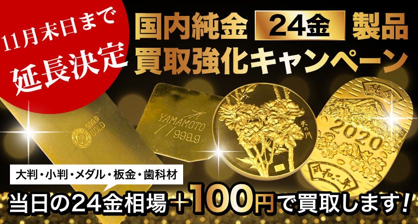 10月1日より開催しております、「国内24金製品買取キャンペーン」の延長が決定いたしました。当初の予定では10月末日終了としておりましたが、24日時点で100名様以上のご利用があり、お喜びの声を多数いただいた結果、11月末日まで延長させていただくことが決定いたしました。相場越えのお値段にて、国内最高クラスのお買取りをさせていただいておりますので、ほぼ赤字同然の企画ではございますが、インフレ円安で苦しむ日本を少しでも応援できるよう継続させていただきます。