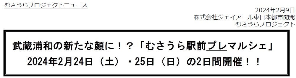 2024年2月24日(土)・25日(日)JR武蔵浦和駅前にて、みんなで楽しめるマルシェイベント「むさうら駅前マルシェ」を開催いたします。今回のプレ(第0回目)マルシェでは、主に武蔵浦和で活動されているHaloHalomamaと連携し、子供から大人まで楽しめるワークショップ、おしゃれな雑貨、おいしい食べ物などをご用意しております。ぜひお越しいただき、家族・友人・地域の方々との交流をお楽しみください。「むさうらプロジェクト」では、武蔵浦和エリアの更なる魅力向上を目的に、地域のみなさまとのコミュニティを育みながら、地域の魅力向上につながる様々な取り組みを始めていきますので、今後ともぜひご注目ください。