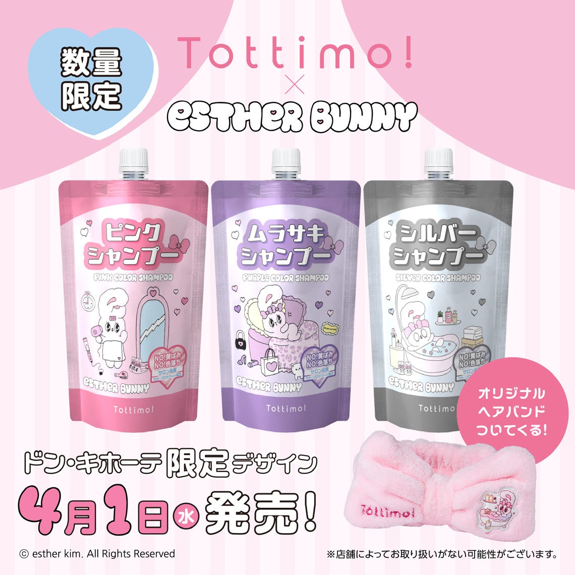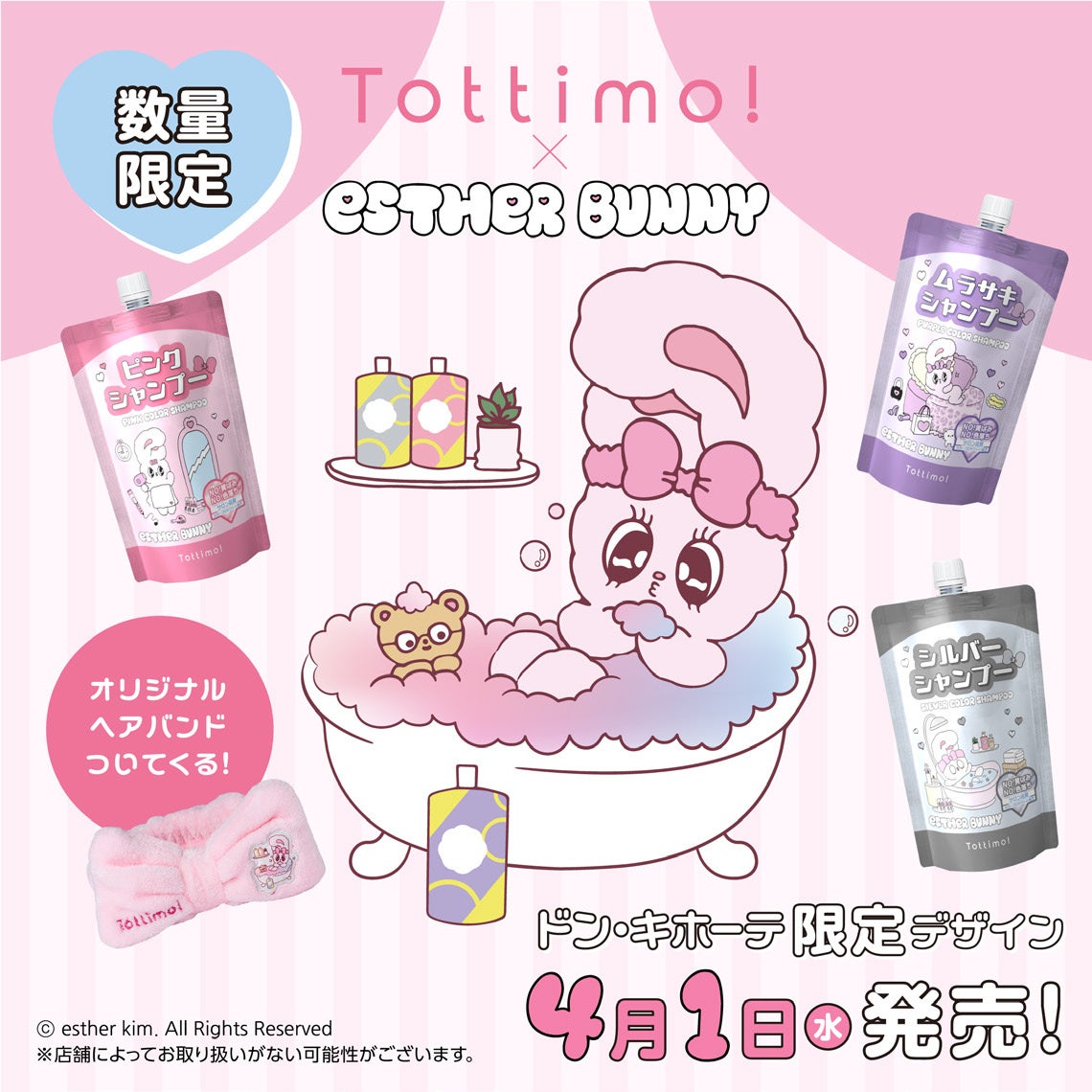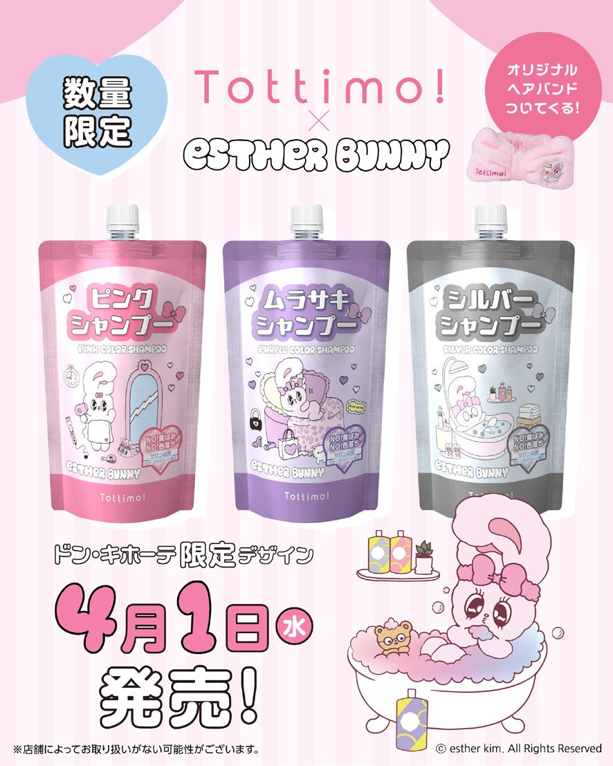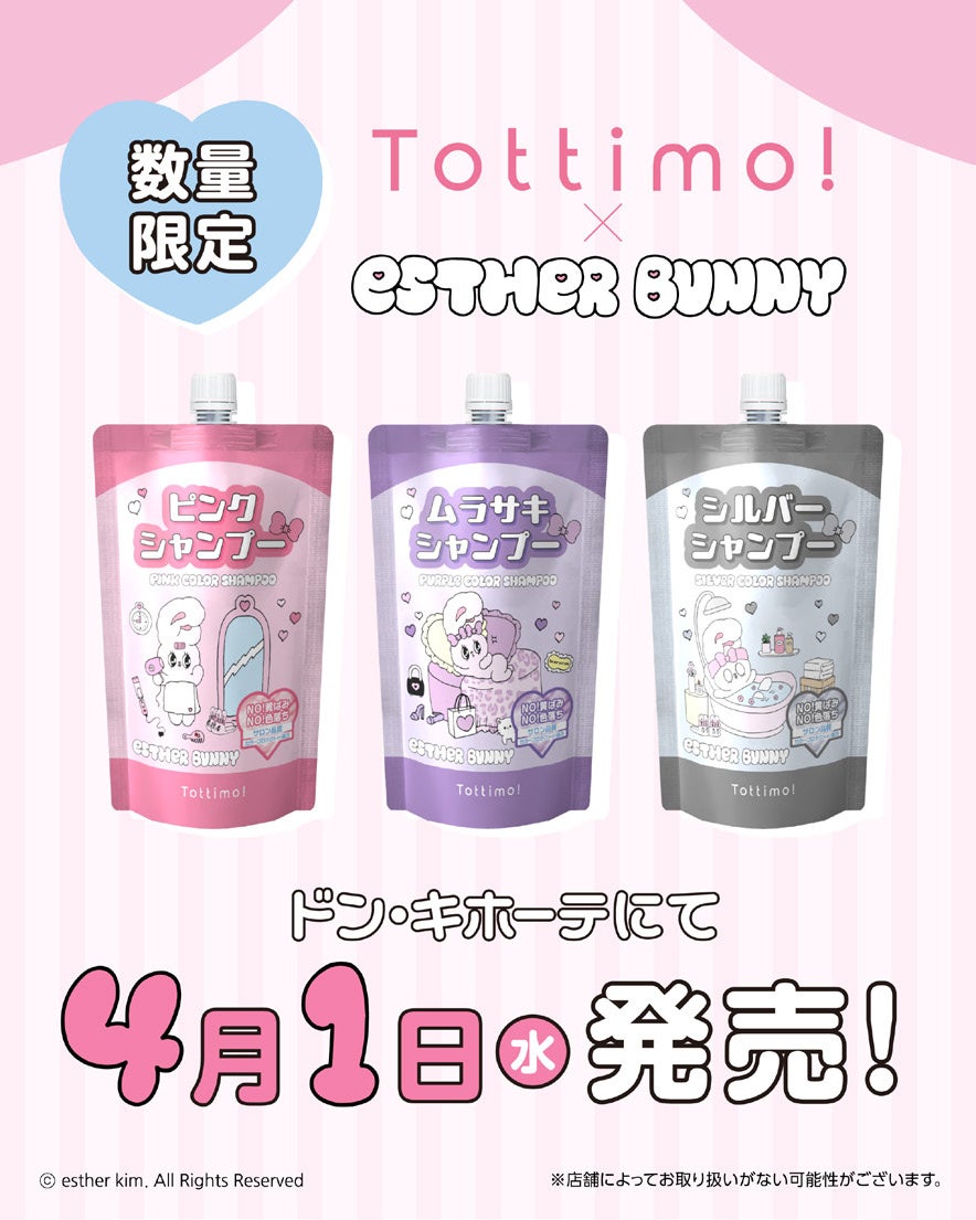株式会社IKホールディングス(本社:愛知県名古屋市 代表取締役:長野庄吾)の100%子会社、株式会社アイケイ(本社:愛知県名古屋市 代表取締役:中島靖隆)は、おしゃれ髪を楽しむ方へ向けた望み通りのヘアスタイルへ導くヘアケアブランド「Tottimo! (トッティモ! )」より、韓国発の大人気キャラクター「Esther Bunny(エスターバニー)」とのコラボレーションによる限定デザインのカラーシャンプーを2026年4月1日より全国のドン・キホーテにて数量限定で発売いたします。