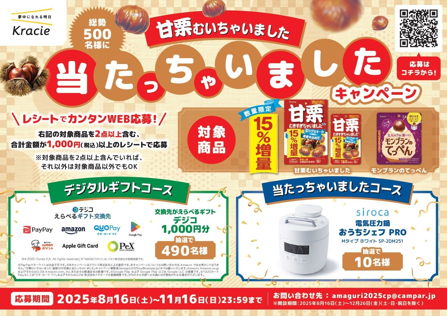 対象商品(「甘栗むいちゃいました35g(15%増量パッケージ)」「甘栗むいちゃいました70g(15%増量パッケージ)」「モンブランのてっぺん」)の中から、2点以上を含む合計金額が1,000円(税込)以上のレシートで応募すると、抽選で素敵なプレゼントが当たるキャンペーンも実施いたします。