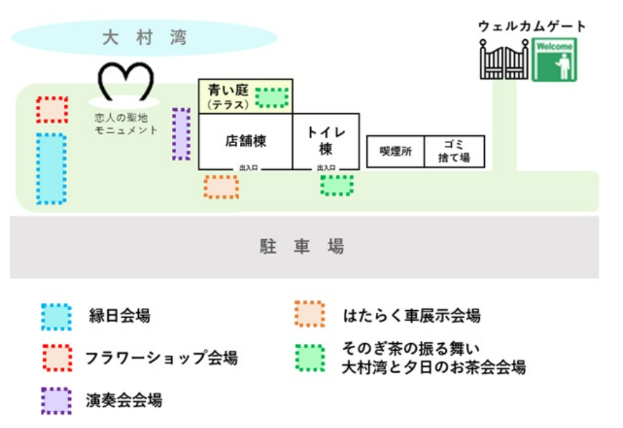 販売会、 大村湾と夕日のお茶会、フラワーショップなど