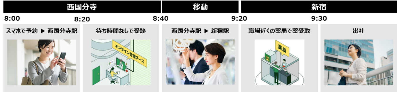 待ち時間なく診察、処方箋の発行、調剤、指定の薬局やロッカーでの薬の受け取りなど、より患者さまの“くらし”に寄り添うサービスの拡充を図ります。