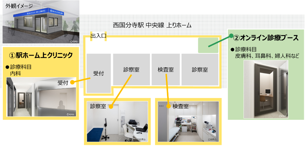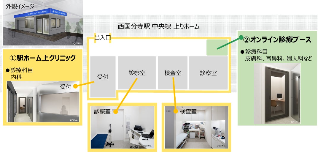 | 〇 JR東日本グループは、駅を“つながる”くらしのプラットフォームへと転換する「Beyond Stations構想」の一環で、オンライン診療サービスを活用した「スマート健康ステーション」の取り組みを推進しています。 〇 このたび、西国分寺駅ホーム上に、対面(リアル)で診療を受けられるだけでなく、非対面(オンライン)でも診療を受けられることで、複数の診療科による総合的な診療が受診できるハイブリッドクリニックを4月に開業します。 〇 今後、日本各地に拡大することで、都心と日本各地の医療格差という社会課題に取り組み、患者さまや医師の空間を越えたあたらしい“くらし”の実現を目指します。 |