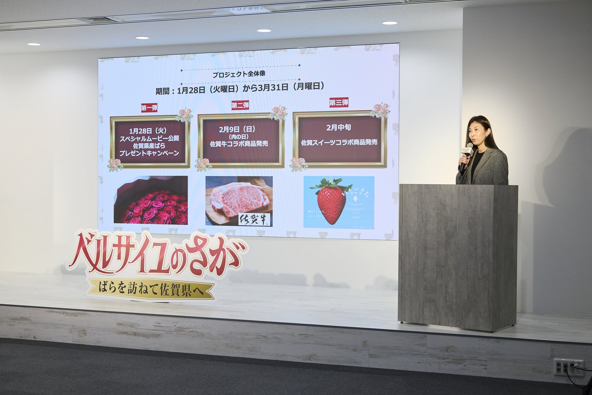 「ベルサイユのさが」プロジェクト記者発表会では、はじめに佐賀県広報広聴課サガプライズ!プロジェクトリーダー 三島智子より本プロジェクトの概要についての説明を行い、マリー・アントワネット一行が「ばら」を訪ねて佐賀県を旅するというオリジナルストーリーを軸にプロジェクト企画を展開することで、佐賀牛などの県産品の魅力を全国へ向けてアピールすることを発表しました。