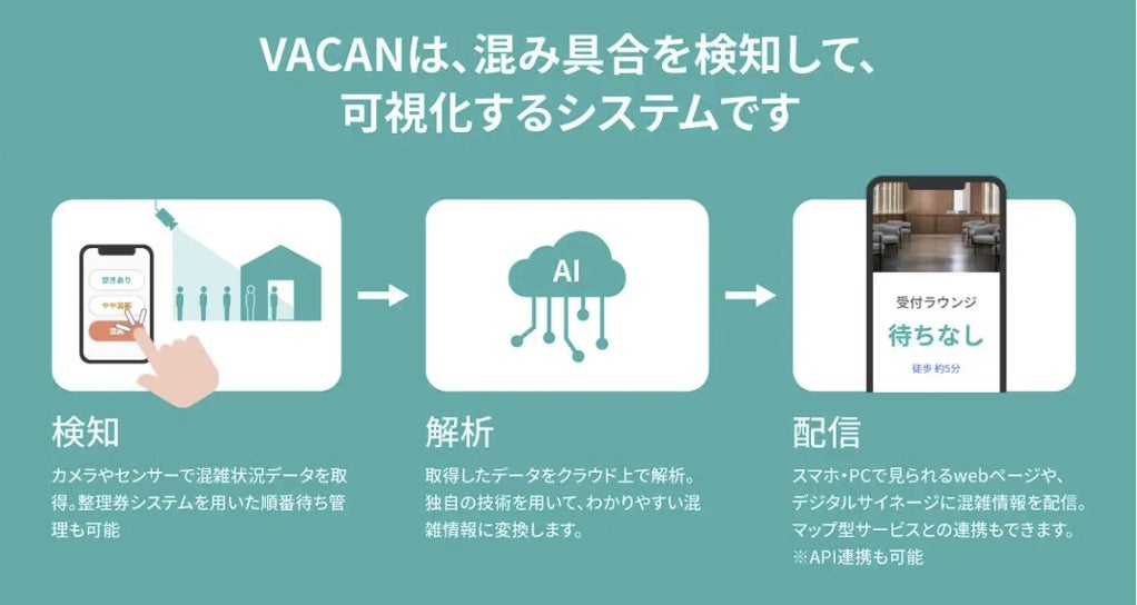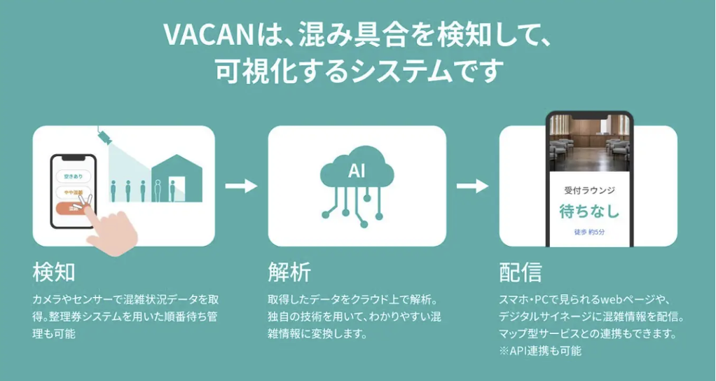 混雑抑制プラットフォーム「VACAN」は、これまでも全国のホテル・旅館などの宿泊施設や、商業施設等に導入されています。同サービスは、混雑や待ちを抑制するための機能を有しており、導入目的に応じて柔軟にソリューションを提供可能です。